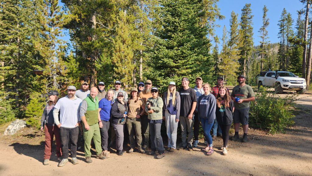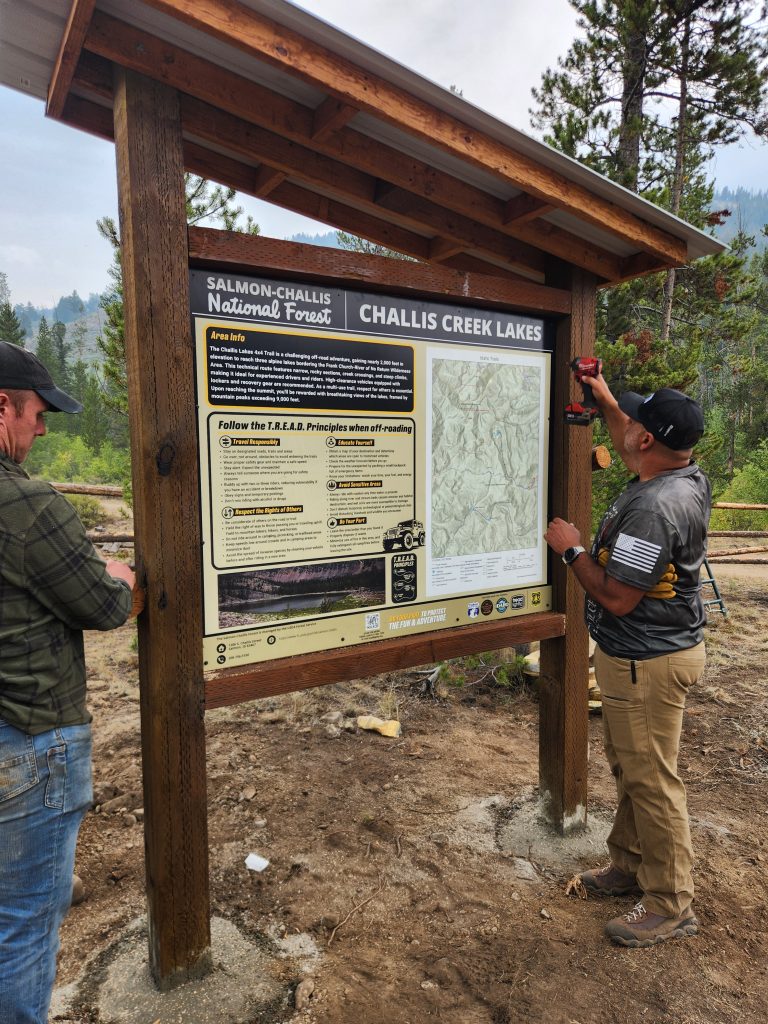 Description: On September 6, 2025, 19 volunteers collaborated with Tread Lightly!, Idaho Parks and Recreation, Salmon-Challis National Forest, Idaho Single Track Alliance and the Mountain West Recreation Alliance to establish a new trailhead and staging area for the Challis Creek Lakes technical 4×4 route in Central Idaho.