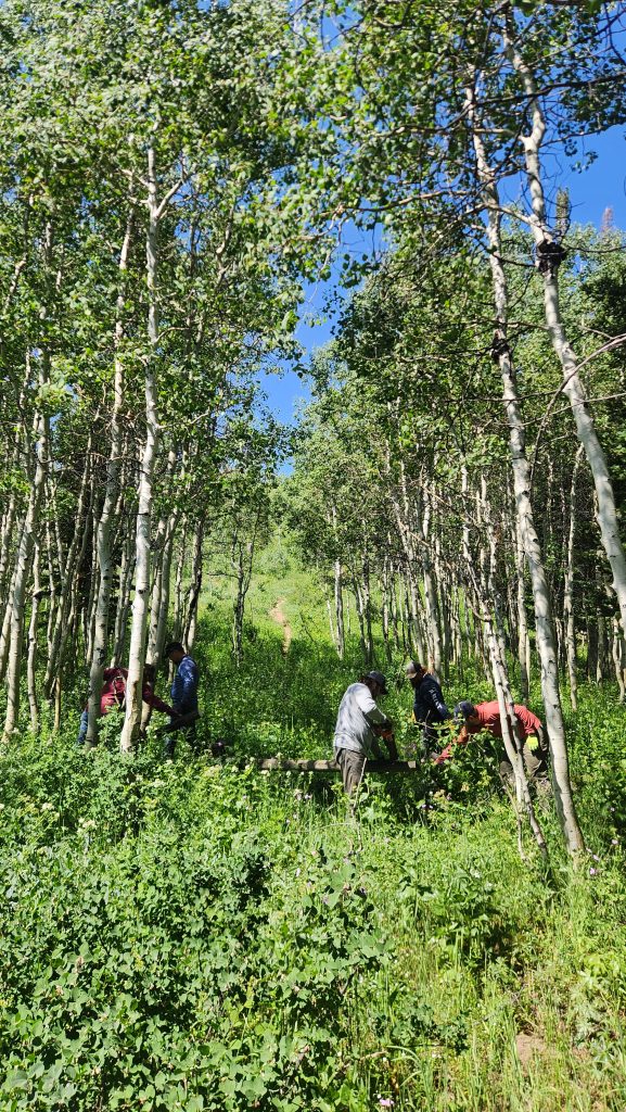 Description: On June 28, 2025, Tread Lightly! staff joined five volunteers from the Dedicated Hunter Program and the Dispersed Recreation Foreman from the Heber-Kamas Ranger District for a stewardship day at Hoyt Peak.