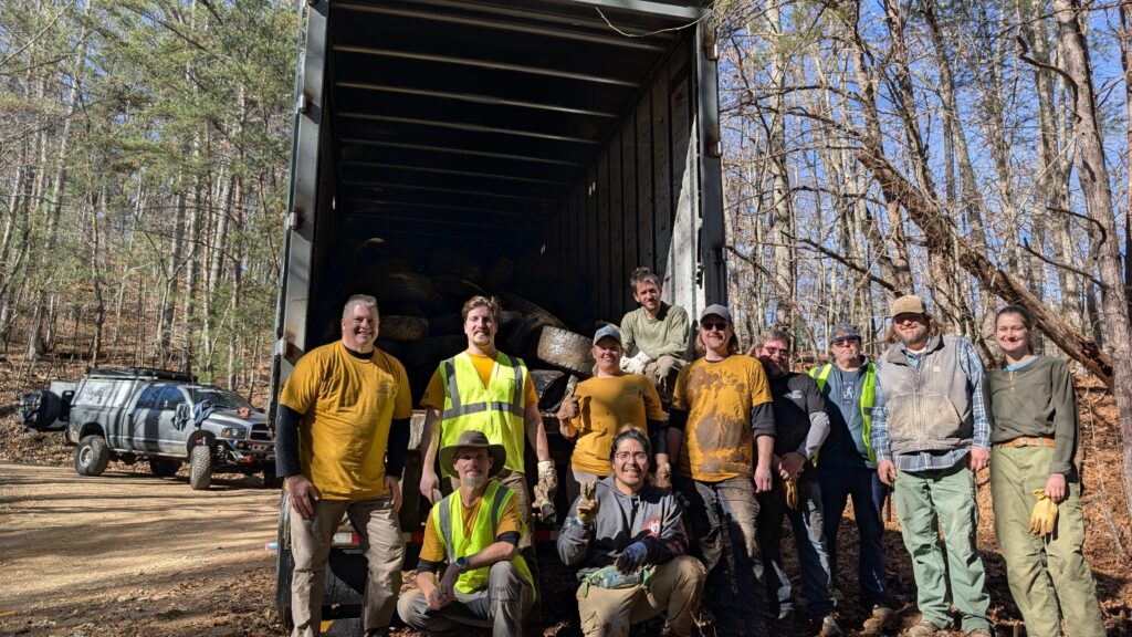“For Sweep Up The Southeast 2025, VUF and the Chattahoochee NF, Blue Ridge Ranger District partnered together to remove 418 tires that had been collected off the forest over approximately the last five years. Tire removal/recycling is quite expensive. These tires were collected across the forest off road banks, down mountains, and in water drains. This also isn’t possible without VUF’s commitment to help the Blue Ridge Ranger District staff maintain access to the forest and protect resources. Their time and effort, along with grants from Tread Lightly! and BFGoodrich Tires are greatly appreciated.”-Jake Beggs, Forestry Technician Blue Ridge Ranger District