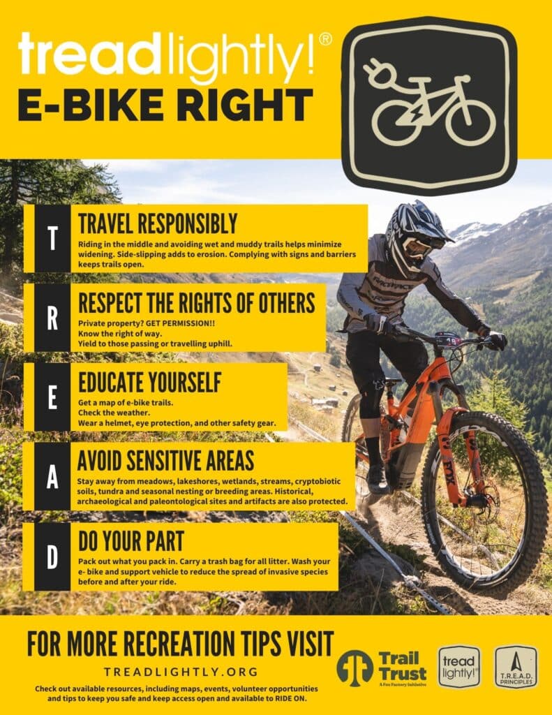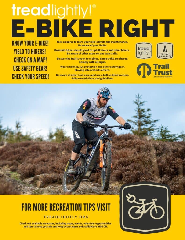 NORTH SALT LAKE, UT. (Dec 3, 2021)— Tread Lightly!, a U.S.-based nonprofit dedicated to promoting responsible outdoor recreation through stewardship and educational programs today announced a new responsible e-bike education campaign in partnership with the Fox Factory Trail Trust Initiative.